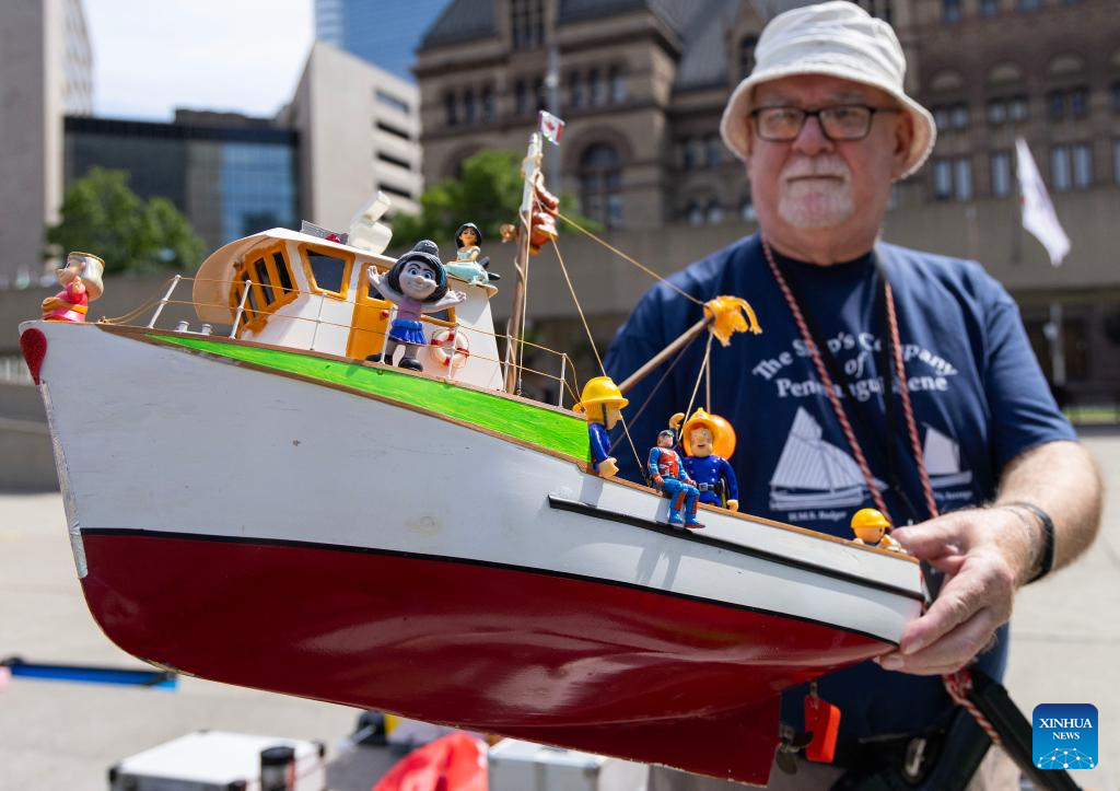 A marine modeller displays a model boat during a model boating race known as the Boating Regatta in the Pond in Toronto, Canada, on June 15, 2025. The event was held here on Sunday, attracting dozens of marine modellers with their different classes of boat models. (Photo by Zou Zheng/Xinhua)