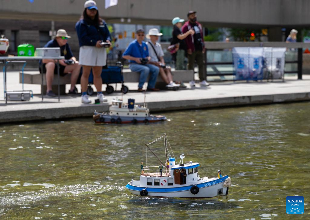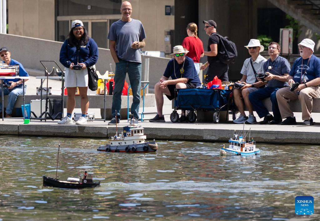 Marine modellers compete in a model boating race known as the Boating Regatta in the Pond in Toronto, Canada, on June 15, 2025. The event was held here on Sunday, attracting dozens of marine modellers with their different classes of boat models. (Photo by Zou Zheng/Xinhua)