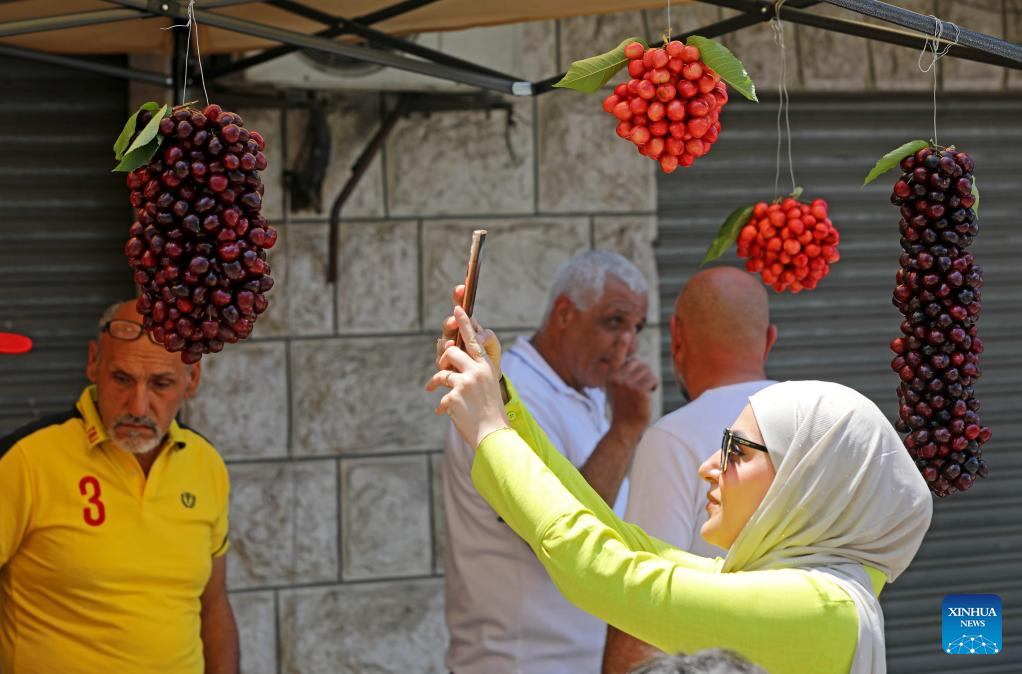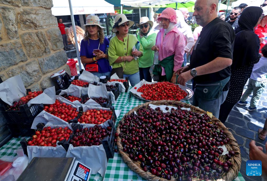 People visit a stall during the Hammana Cherry Festival at the village of Hammana, Mount Lebanon, Lebanon, on June 15, 2025. The annual event features local cherry products, traditional music, and artisan displays, highlighting the agricultural and cultural richness of the region during the cherry harvest season. (Xinhua/Bilal Jawich)