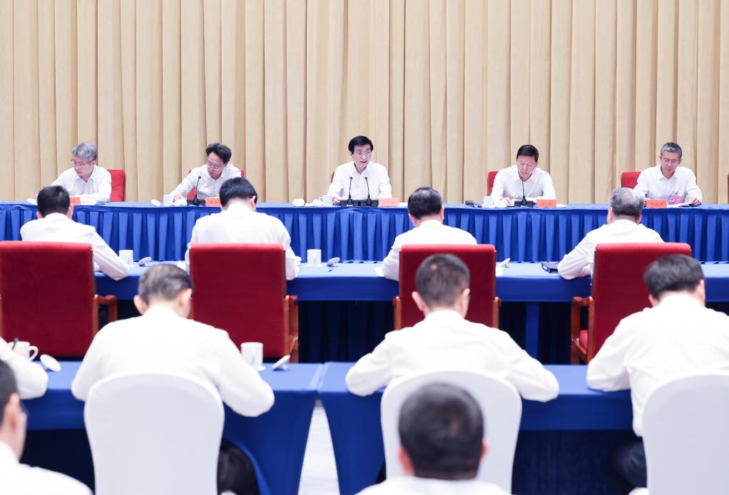 Wang Huning, a member of the Standing Committee of the Political Bureau of the Communist Party of China Central Committee and chairman of the National Committee of the Chinese People's Political Consultative Conference, speaks while attending a meeting on promoting the high-quality development of the demonstration zone for cross-Strait integrated development in Xiamen, southeast China's Fujian Province, June 15, 2025. (Xinhua/Yao Dawei)