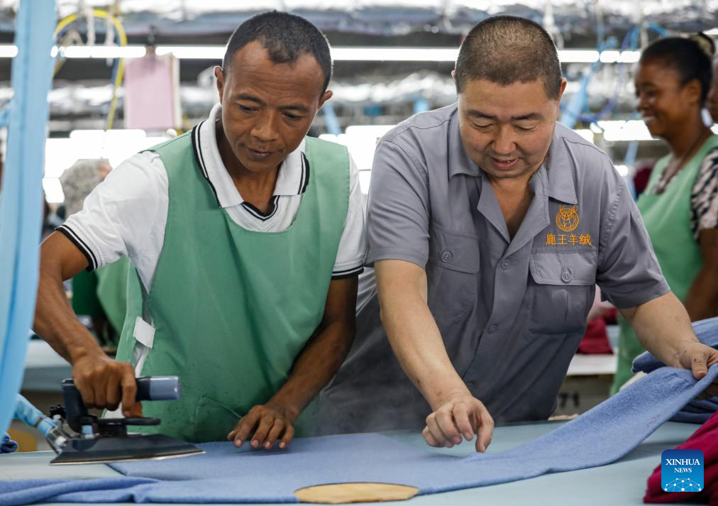 A Chinese staff member offers technical guidance to a local worker at a factory of China's Inner Mongolia King Deer Cashmere Group on the southern outskirts of Madagascar's capital, Antananarivo, on March 28, 2025. (Xinhua/Li Yahui)