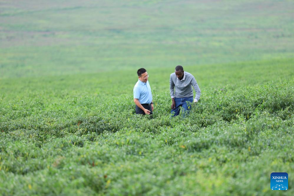A business manager of Hunan Modern Agriculture International Development Co. Ltd. checks the growth condition of chili peppers with a local staff member at the Gashora Farm in Nyagatare district, Rwanda, May 22, 2025. (Xinhua/Ji Li)