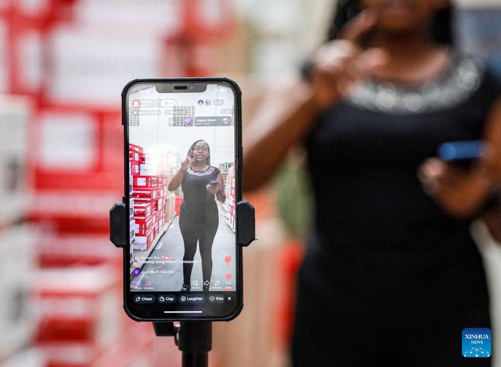 A staff member of Kilimall sells products via live-streaming in Mlolongo, Kenya, on June 3, 2025. (Xinhua/Li Yahui)