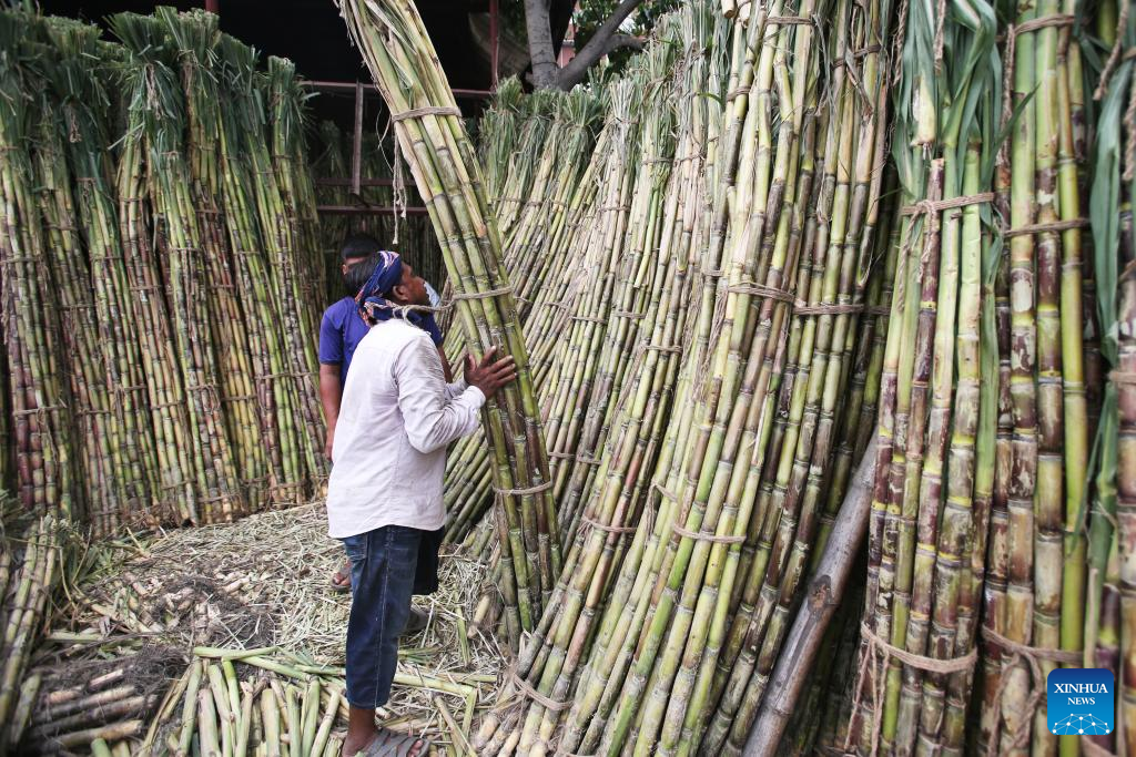 A farmer sorts sugarcane at a wholesale market in Dhaka, Bangladesh, June 14, 2025. Bangladesh has entered its fruit harvest season recently. (Photo by Habibur Rahman/Xinhua)