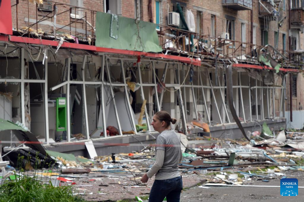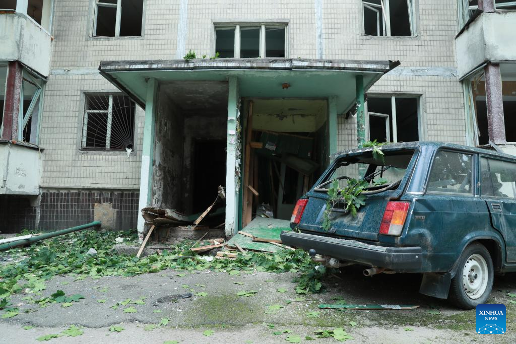 Debris is pictured near a destroyed building after a Russian missile attack in Kiev, Ukraine, June 17, 2025. (Xinhua/Li Dongxu)