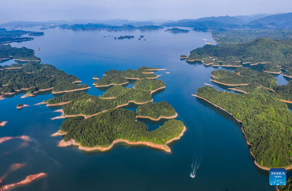 An aerial drone photo taken on June 3, 2025 shows a view of the Qiandao Lake in east China's Zhejiang Province. Chun'an, located in east China's Zhejiang Province, is renowned for its water system and outstanding natural environment. As a national-level ecological county, it serves as a model for ecological protection and construction. (Xinhua/Xu Yu)
