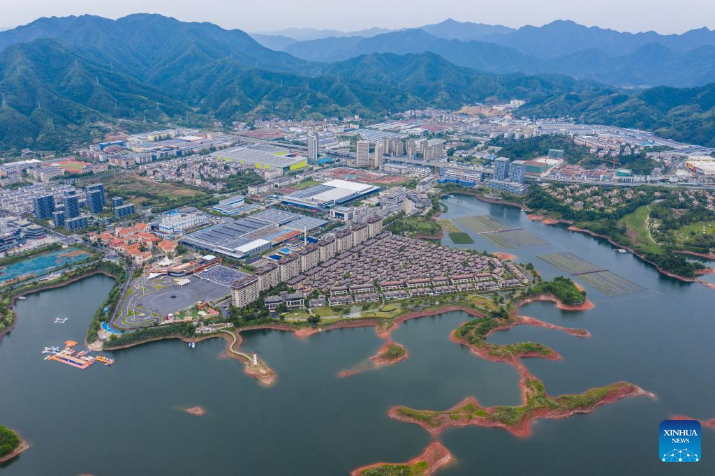 An aerial drone photo taken on June 3, 2025 shows a view of the Chun'an economic development zone in east China's Zhejiang Province. Chun'an, located in east China's Zhejiang Province, is renowned for its water system and outstanding natural environment. As a national-level ecological county, it serves as a model for ecological protection and construction. (Xinhua/Xu Yu)