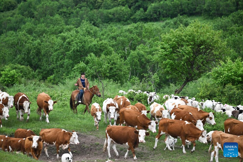 Saintsogt's wife drives the cattle on his way to the summer campsite on Ar Horqin Grassland, Chifeng City of north China's Inner Mongolia Autonomous Region, June 14, 2025.