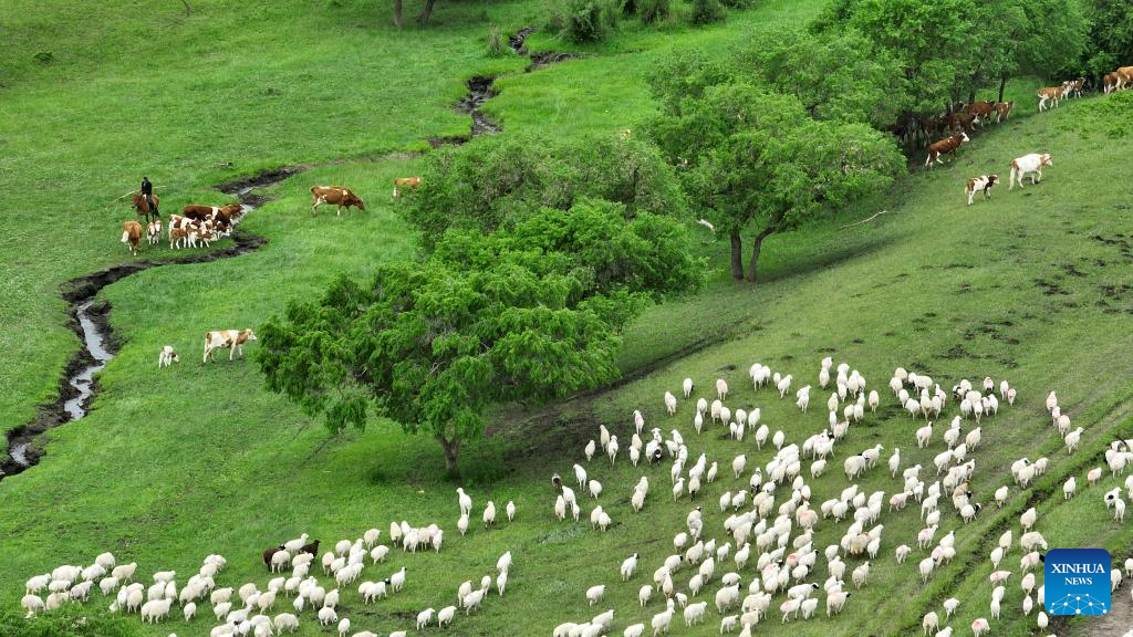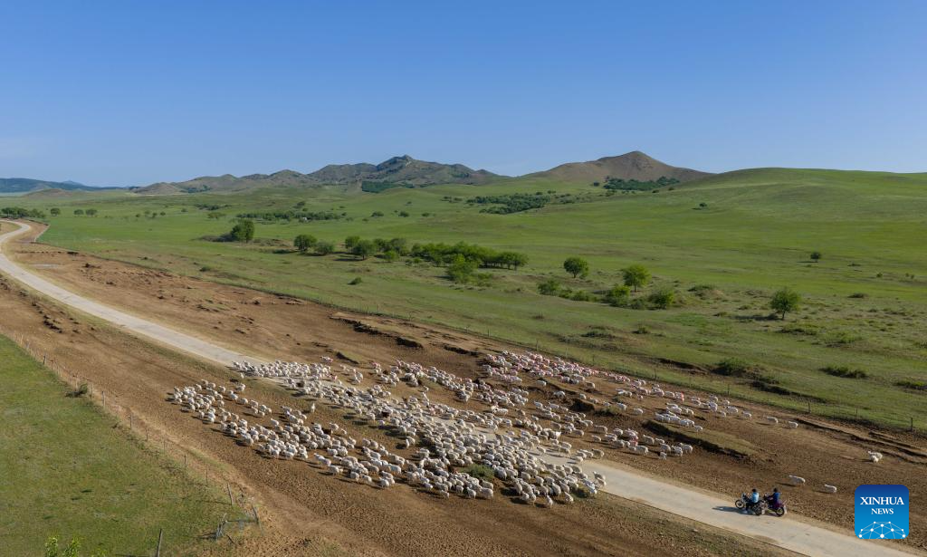 An aerial drone photo taken on June 14, 2025 shows Saintsogt driving the livestock on his way to the summer campsite on Ar Horqin Grassland, Chifeng City of north China's Inner Mongolia Autonomous Region.