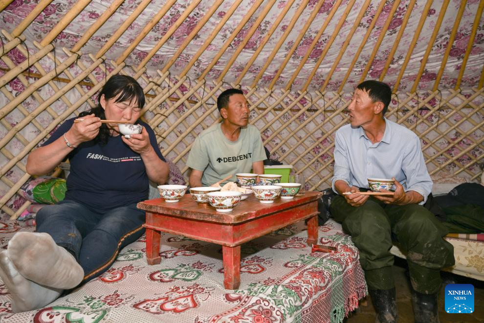 Saintsogt (R) has a meal with his wife and nephew at a Mongolian yurt on Ar Horqin Grassland, Chifeng City of north China's Inner Mongolia Autonomous Region, June 14, 2025.