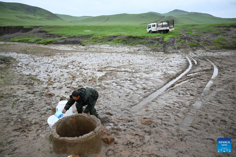 Saintsogt fetches water at a spring at the summer campsite on Ar Horqin Grassland, Chifeng City of north China's Inner Mongolia Autonomous Region, June 15, 2025.