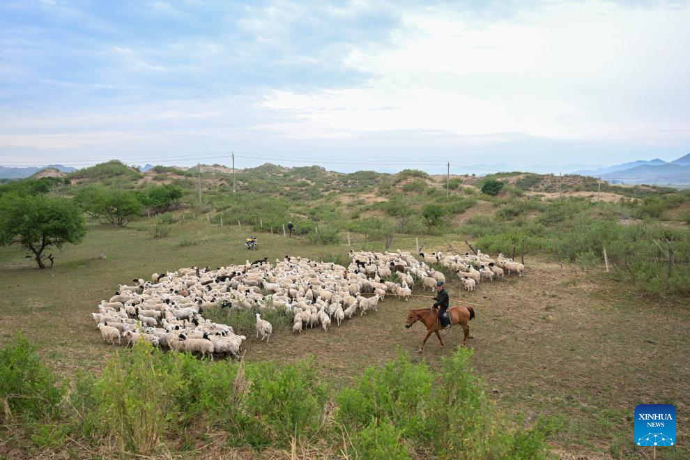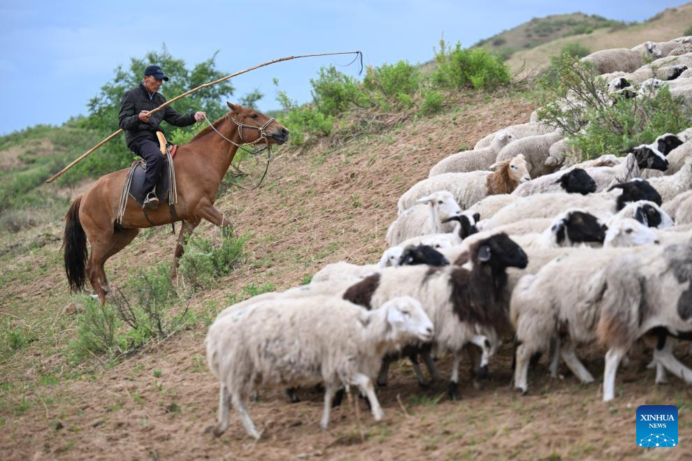 Saintsogt gathers the livestock at the winter campsite before departing for the summer campsite on Ar Horqin Grassland, Chifeng City of north China's Inner Mongolia Autonomous Region, June 13, 2025.