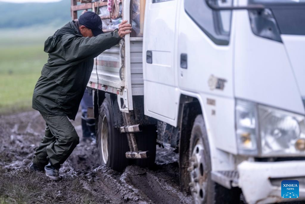 Saintsogt pushes his truck which is stranded in the mud on his way to the summer campsite on Ar Horqin Grassland, Chifeng City of north China's Inner Mongolia Autonomous Region, June 14, 2025.