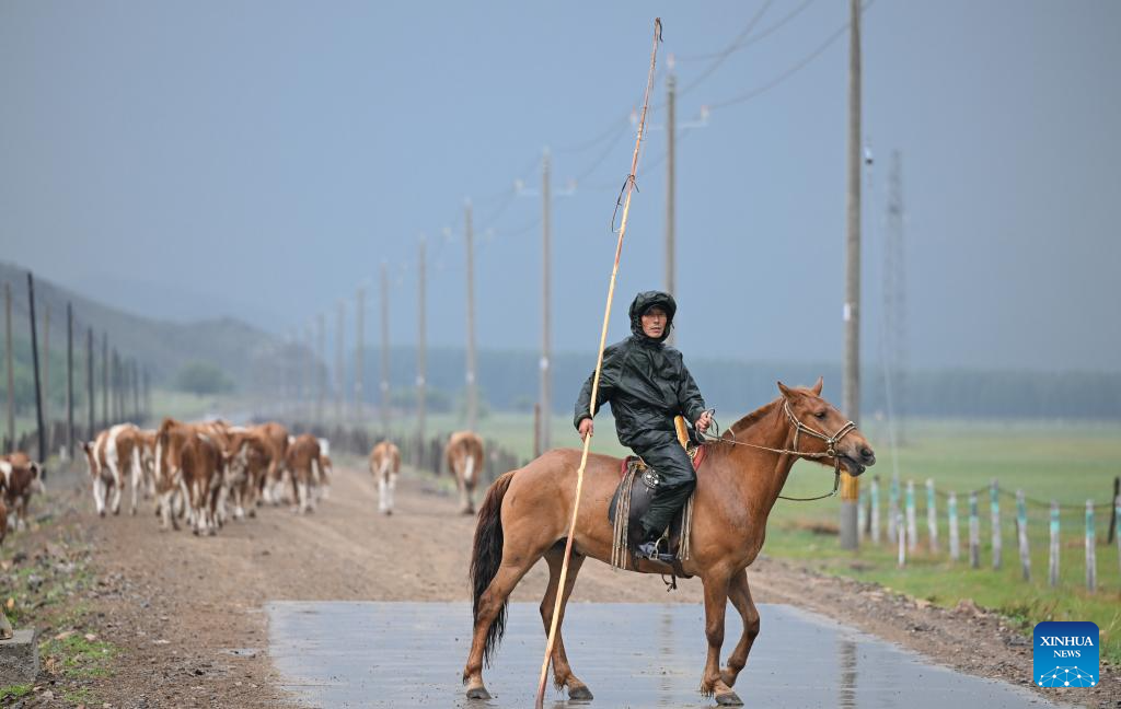 Saintsogt drives cattle in the rain on his way to the summer campsite on Ar Horqin Grassland, Chifeng City of north China's Inner Mongolia Autonomous Region, June 13, 2025.