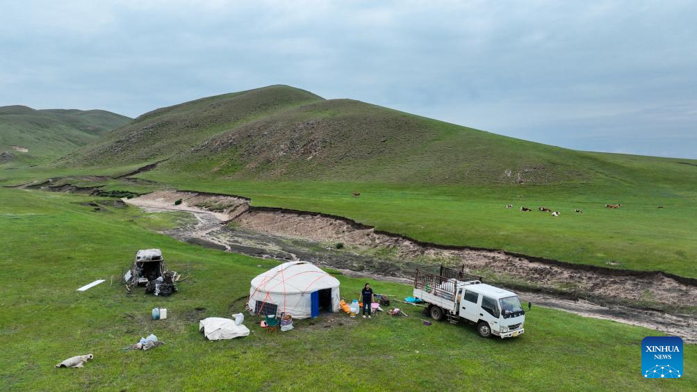 An aerial drone photo taken on June 15, 2025 shows a Mongolian yurt of Saintsogt at his summer campsite on Ar Horqin Grassland, Chifeng City of north China's Inner Mongolia Autonomous Region.