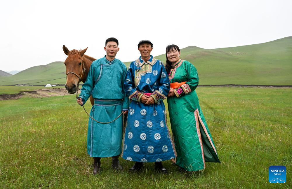 Saintsogt (C), his wife (R) and son pose for a group photo at their summer campsite on Ar Horqin Grassland, Chifeng City of north China's Inner Mongolia Autonomous Region, June 15, 2025.