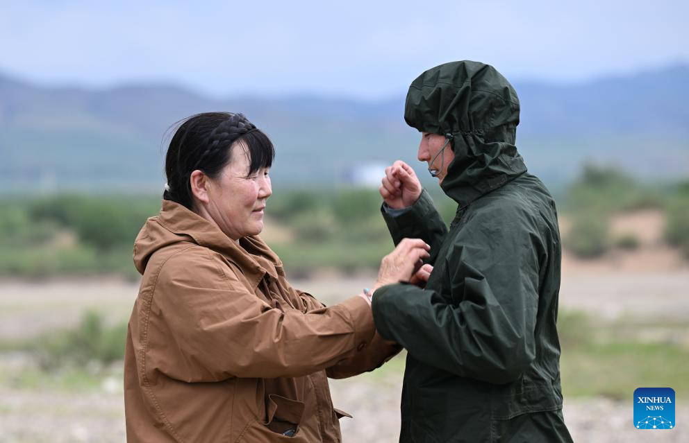 Saintsogt's wife (L) helps her son to wear a raincoat on their way to the summer campsite on Ar Horqin Grassland, Chifeng City of north China's Inner Mongolia Autonomous Region, June 13, 2025.
