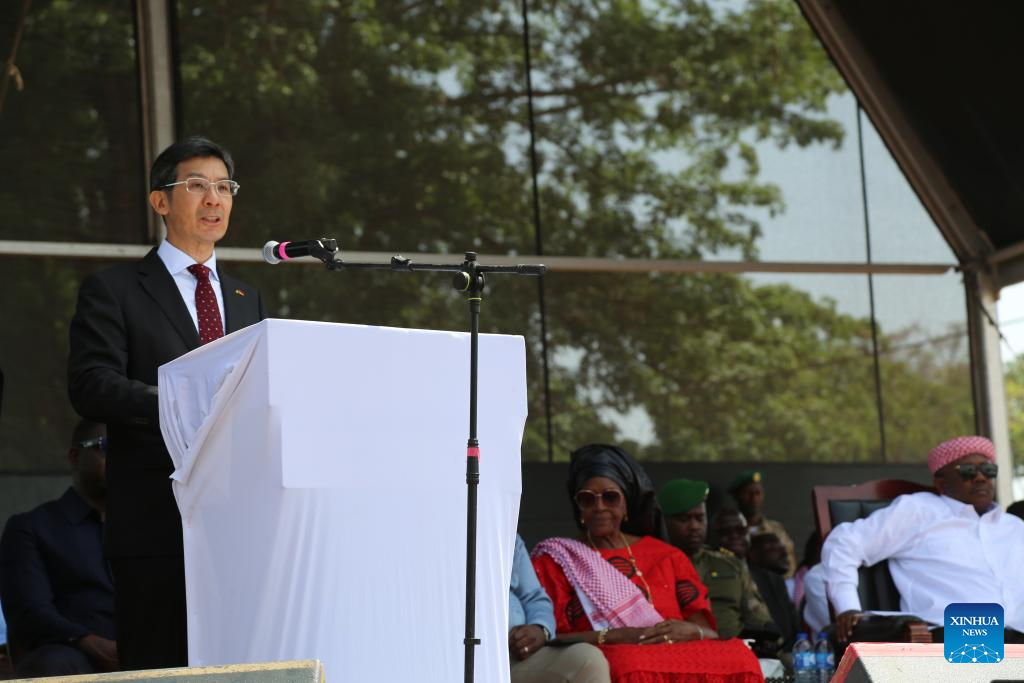 Chinese Ambassador to Guinea-Bissau Yang Renhuo speaks at the inauguration ceremony of a highway constructed by a Chinese company in Bissau, Guinea-Bissau, on June 16, 2025. Bissau-Guinean President Umaro Sissoco Embalo on Monday presided over the inauguration ceremony of a highway linking the capital Bissau to its suburb of Safim, covering a distance of 8.2 kilometers.