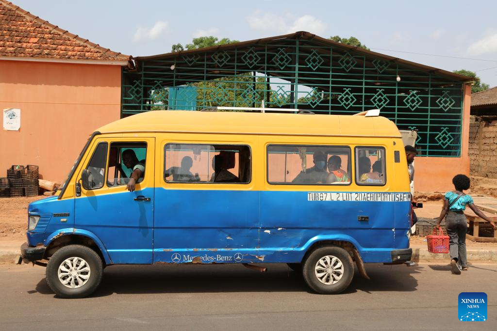 A bus parks on a highway constructed by a Chinese company in Safim, Guinea-Bissau, June 15, 2025. The China-funded highway, which links the capital Bissau to its suburb of Safim, inaugurated on June 16.