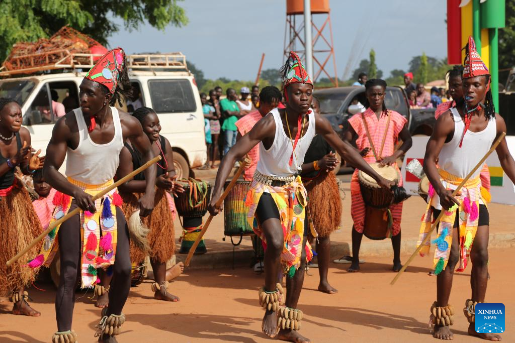 Locals dance at the inauguration ceremony of a highway constructed by a Chinese company in Bissau, Guinea-Bissau, on June 16, 2025. Bissau-Guinean President Umaro Sissoco Embalo on Monday presided over the inauguration ceremony of a highway linking the capital Bissau to its suburb of Safim, covering a distance of 8.2 kilometers.
