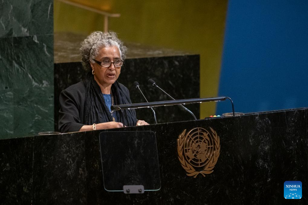 Sophia Yohannes, Eritrea's ambassador to the United Nations, introduces a draft resolution at the UN headquarters in New York, on June 16, 2025. The General Assembly on Monday adopted a resolution to proclaim Dec. 4 every year as the International Day Against Unilateral Coercive Measures. (Manuel Elias/UN Photo/Handout via Xinhua)
