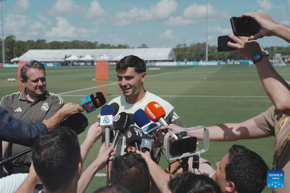 Brahim Diaz of Real Madrid is interviewed during a training session in Florida on June 17, 2025, ahead of the Club World Cup 2025 football match between Spain's Real Madrid and Saudi Arabia's Al Hilal. (Xinhua/Huang Zongzhi)