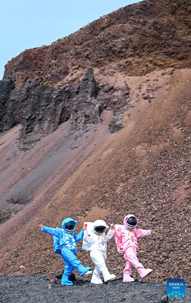 Tourists in spacesuits pose for a photo in front of a volcano of the Ulanhada volcano cluster, Qahar Right Wing Rear Banner of Ulanqab, north China's Inner Mongolia Autonomous Region, June 17, 2025. The Ulanhada volcano cluster boasts special geological landscapes such as volcanoes and lava landform. With summer's arrival, it has entered the peak tourist season. (Xinhua/Bei He)