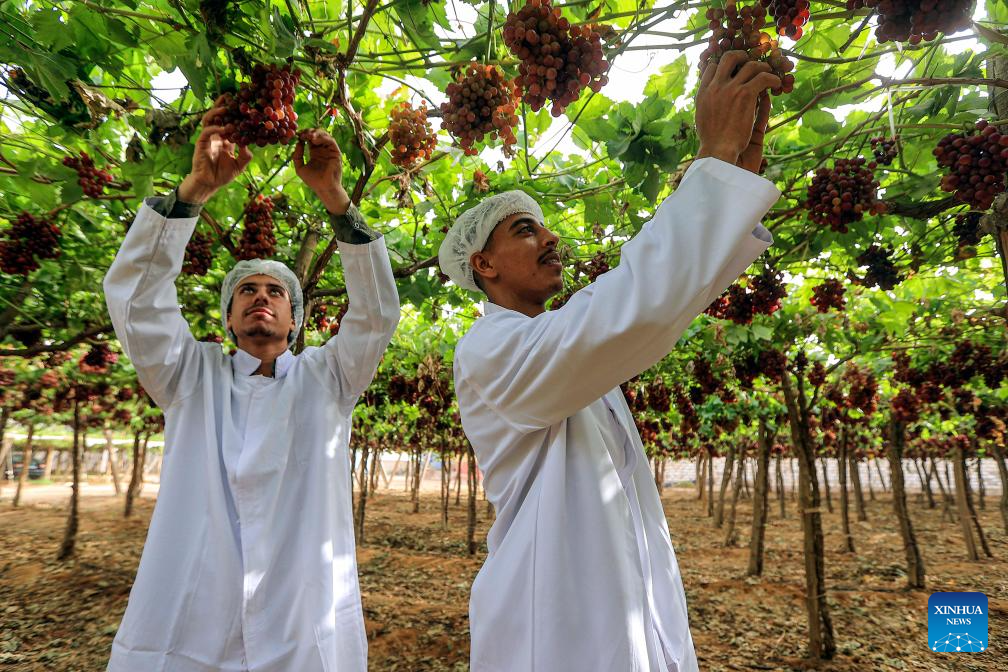 Farmers harvest grapes at a farm during the harvest season in Menoufia Governorate, Egypt, on June 17, 2025. (Xinhua/Ahmed Gomaa)