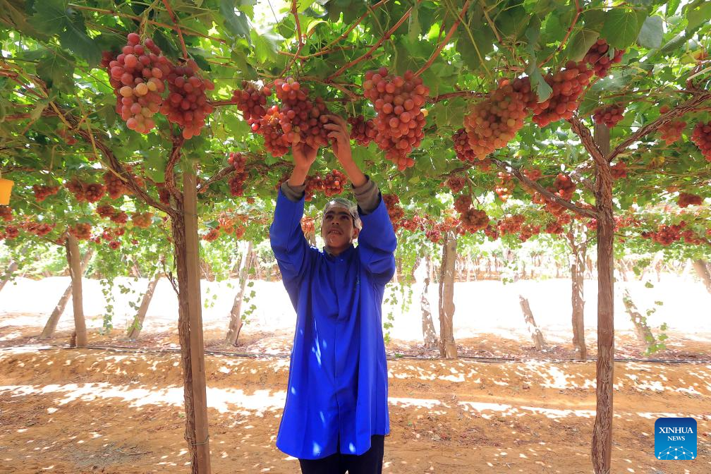A farmer harvests grapes at a farm during the harvest season in Menoufia Governorate, Egypt, on June 17, 2025. (Xinhua/Ahmed Gomaa)