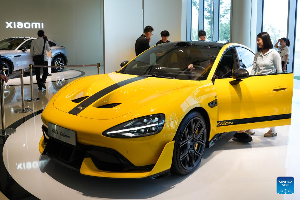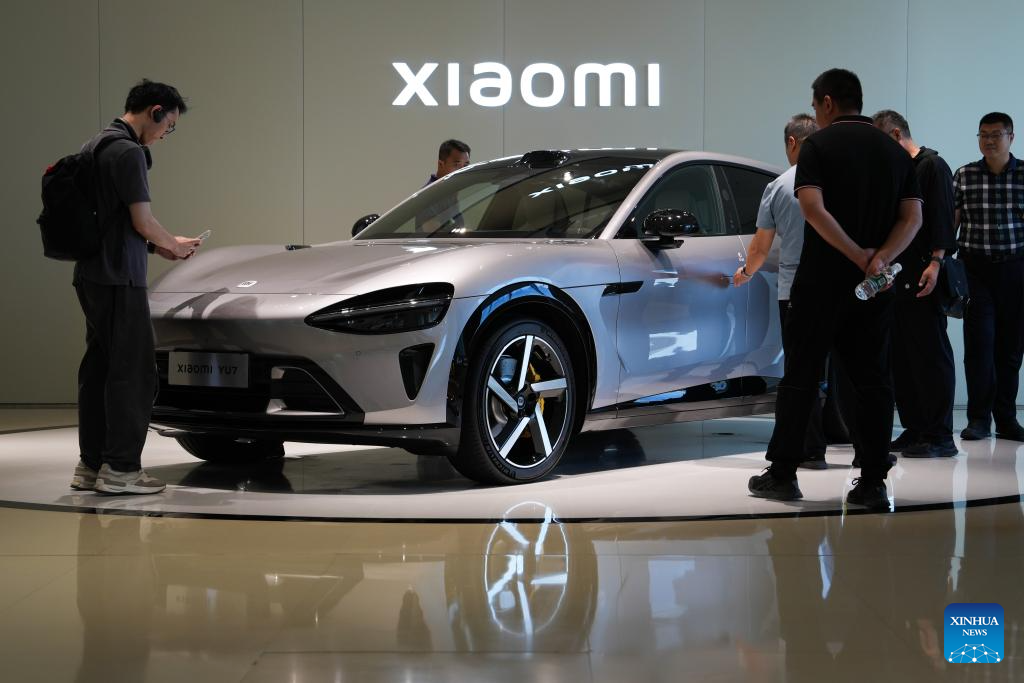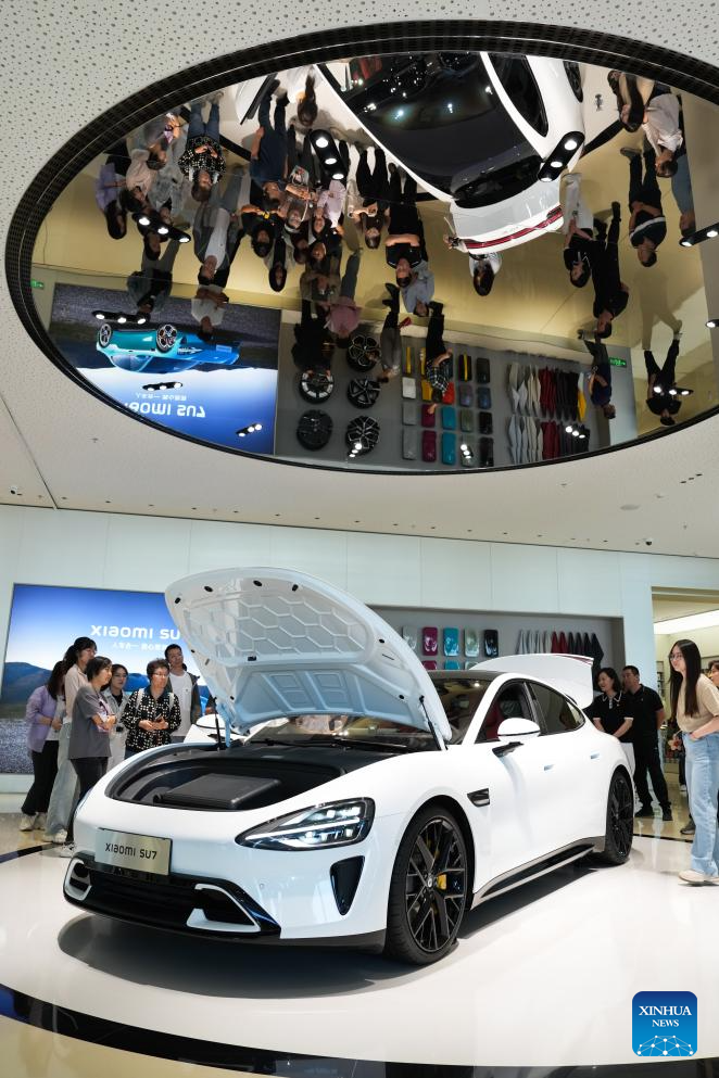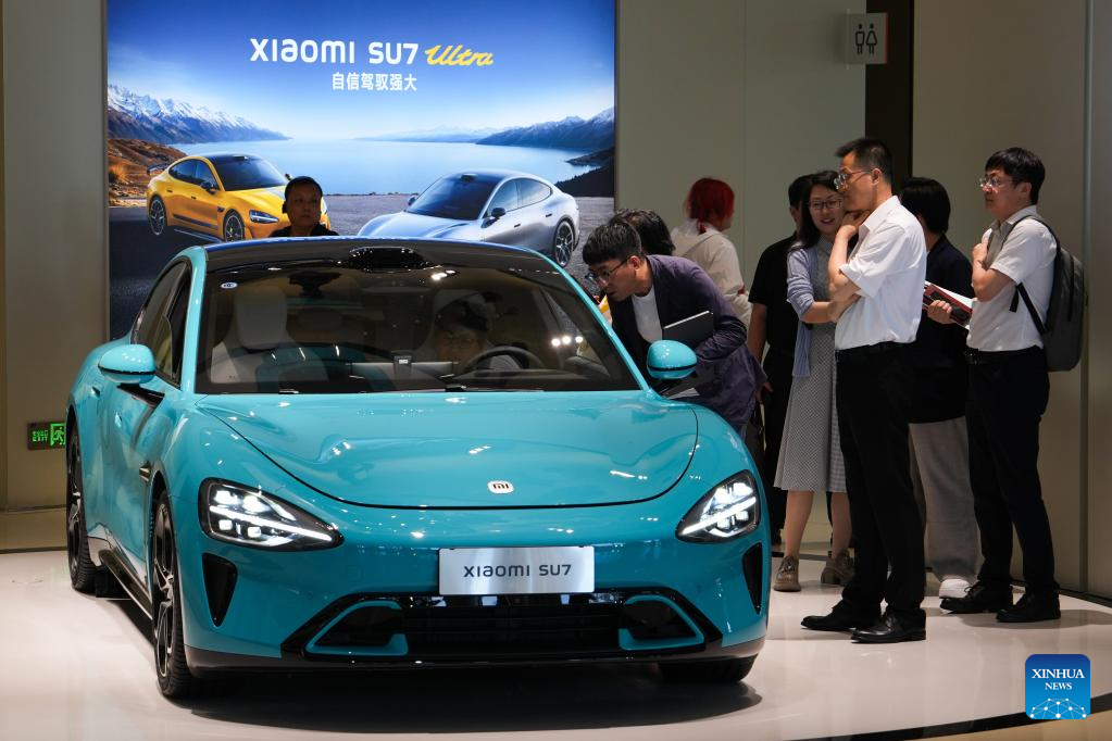 Visitors learn about a new energy vehicle at Xiaomi's automobile factory in Beijing, capital of China, June 16, 2025. Located in the Beijing Economic-Technological Development Area, China's tech giant Xiaomi's automobile factory sprawls across over 700,000 square meters. Integrating research, testing, production and sales, the factory is open to the public to showcase its cutting-edge automotive production capabilities. (Xinhua/Zheng Huansong)