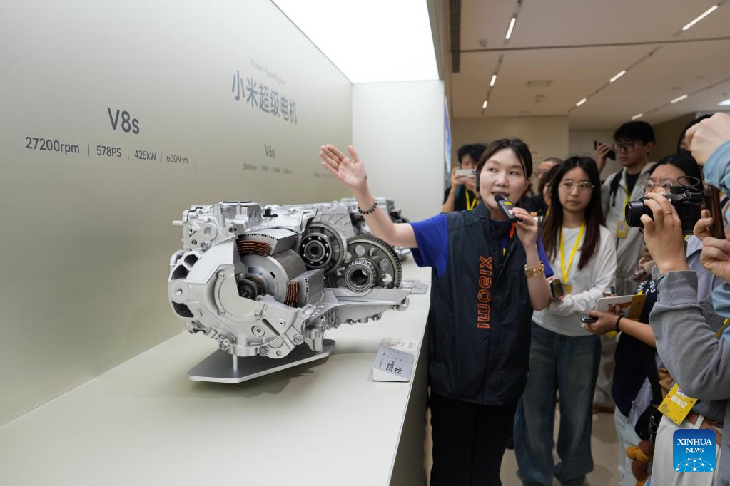 Visitors learn about Xiaomi's HyperEngine at Xiaomi's automobile factory in Beijing, capital of China, June 16, 2025. Located in the Beijing Economic-Technological Development Area, China's tech giant Xiaomi's automobile factory sprawls across over 700,000 square meters. Integrating research, testing, production and sales, the factory is open to the public to showcase its cutting-edge automotive production capabilities. (Xinhua/Zheng Huansong)