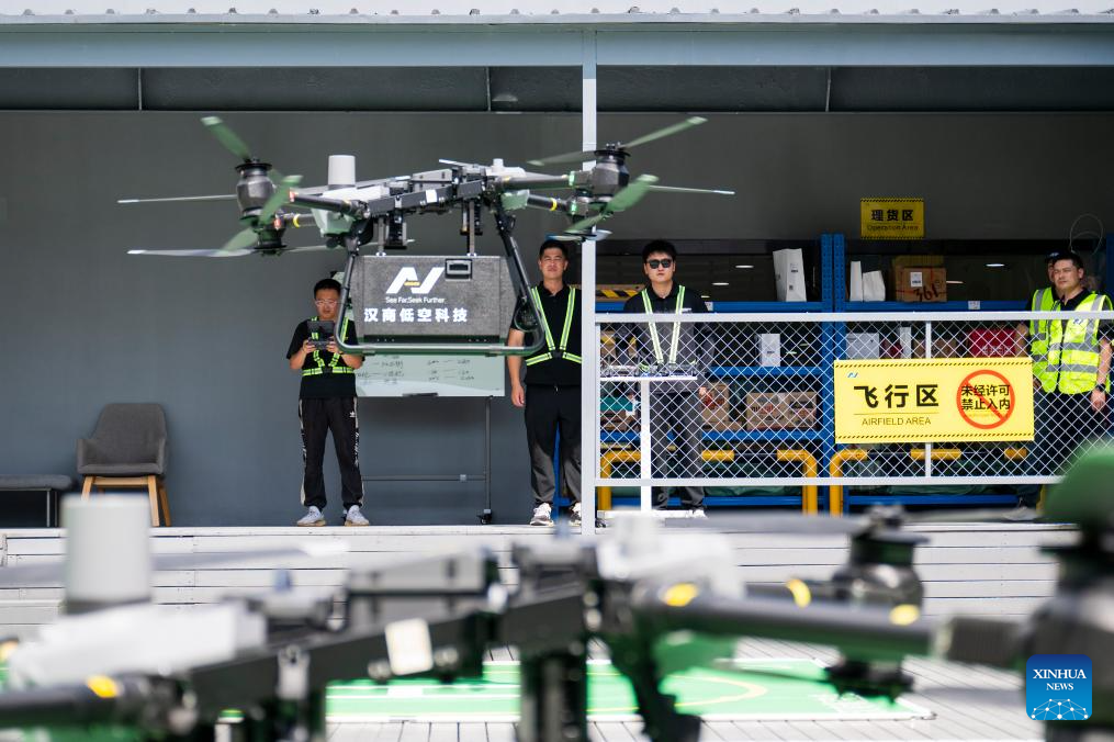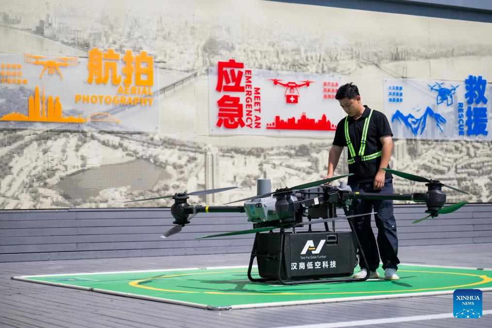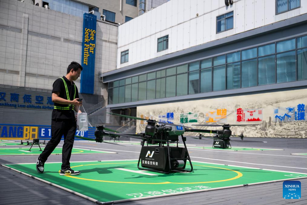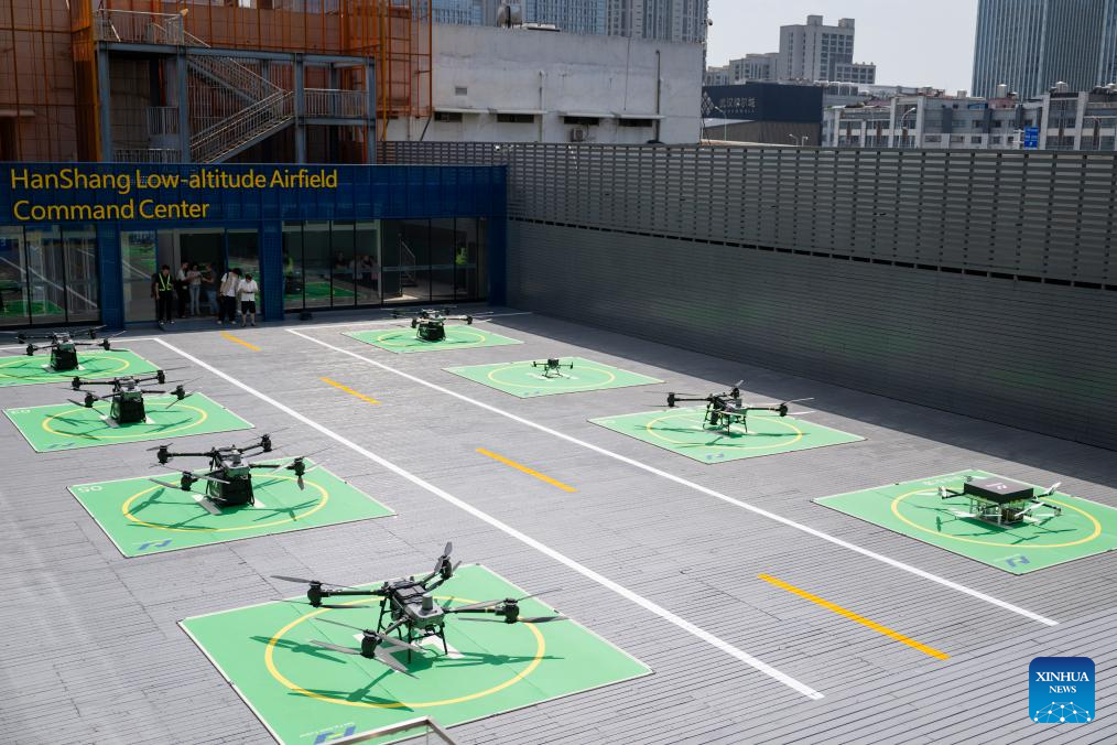 This photo taken on June 16, 2025 shows the Hanshang Low-altitude Airfield in Wuhan, central China's Hubei Province. Ten new drone routes linking Wuchang, Hankou and Hanyang in Wuhan were officially put into operation on Monday. The low-altitude flying service consists of a digital real-time dispatching platform, 2 smart command centers, 10 low-altitude routes and 22 intelligent aprons. It facilitates the delivery of goods such as seafood, fresh flowers and medicines. (Xinhua/Wu Zhizun)
