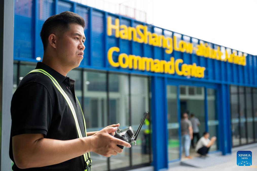 A staff member controls a drone to take off from Hanshang Low-altitude Airfield in Wuhan, central China's Hubei Province, June 16, 2025. Ten new drone routes linking Wuchang, Hankou and Hanyang in Wuhan were officially put into operation on Monday. The low-altitude flying service consists of a digital real-time dispatching platform, 2 smart command centers, 10 low-altitude routes and 22 intelligent aprons. It facilitates the delivery of goods such as seafood, fresh flowers and medicines. (Xinhua/Wu Zhizun)