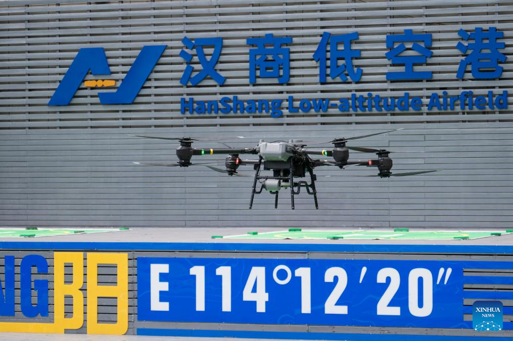 A drone takes off from Hanshang Low-altitude Airfield in Wuhan, central China's Hubei Province, June 16, 2025. Ten new drone routes linking Wuchang, Hankou and Hanyang in Wuhan were officially put into operation on Monday. The low-altitude flying service consists of a digital real-time dispatching platform, 2 smart command centers, 10 low-altitude routes and 22 intelligent aprons. It facilitates the delivery of goods such as seafood, fresh flowers and medicines. (Xinhua/Wu Zhizun)