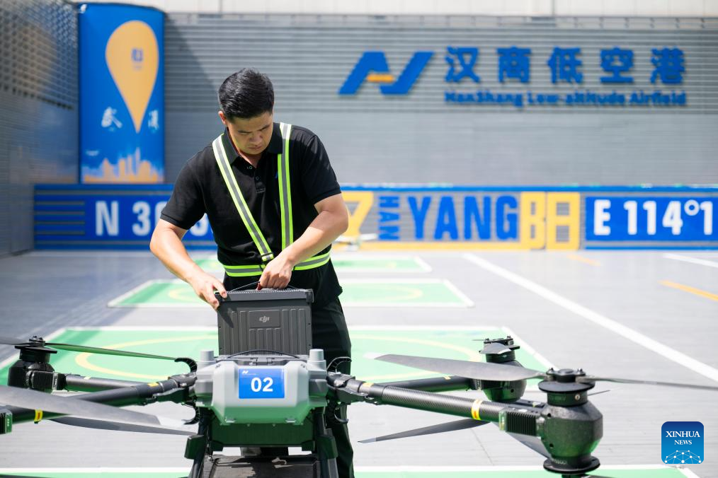 A staff member changes battery for a drone at Hanshang Low-altitude Airfield in Wuhan, central China's Hubei Province, June 16, 2025. Ten new drone routes linking Wuchang, Hankou and Hanyang in Wuhan were officially put into operation on Monday. The low-altitude flying service consists of a digital real-time dispatching platform, 2 smart command centers, 10 low-altitude routes and 22 intelligent aprons. It facilitates the delivery of goods such as seafood, fresh flowers and medicines. (Xinhua/Wu Zhizun)
