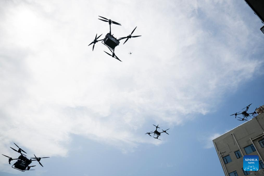 Drones take off from Hanshang Low-altitude Airfield in Wuhan, central China's Hubei Province, June 16, 2025. Ten new drone routes linking Wuchang, Hankou and Hanyang in Wuhan were officially put into operation on Monday. The low-altitude flying service consists of a digital real-time dispatching platform, 2 smart command centers, 10 low-altitude routes and 22 intelligent aprons. It facilitates the delivery of goods such as seafood, fresh flowers and medicines. (Xinhua/Wu Zhizun)
