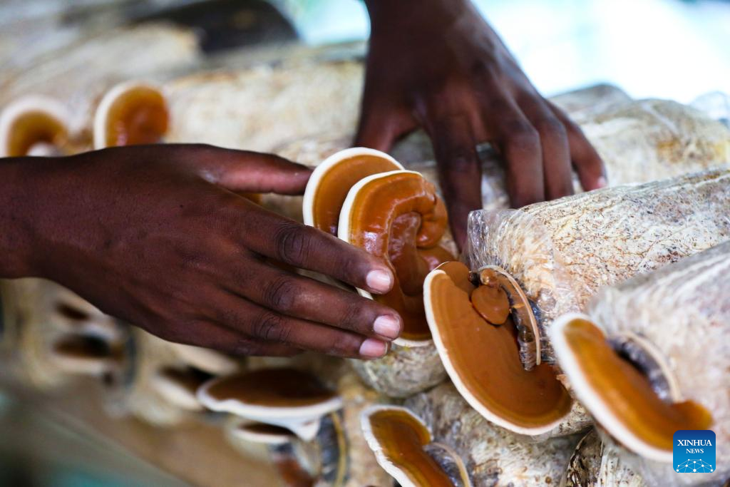 Joel Bisoma displays Lingzhi, or Ganoderma lucidum, cultivated with Juncao technology at his farm in Dar es Salaam, Tanzania, June 5, 2025. (Xinhua/Emmanuel Herman)