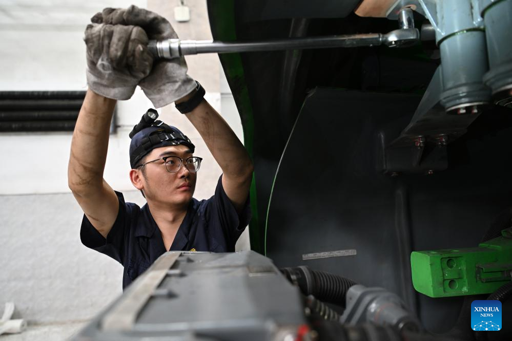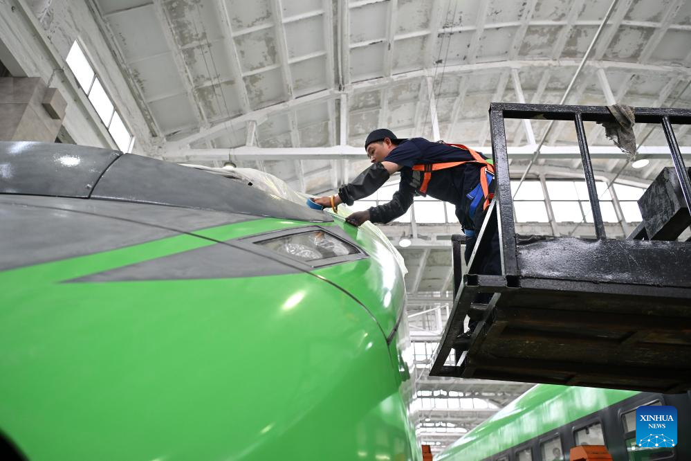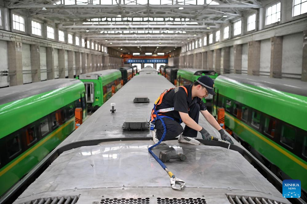 A staff member examines and maintains a train at a depot of China Railway Taiyuan Group Co., Ltd. in Taiyuan, north China's Shanxi Province, June 17, 2025. Staff memebers of China Railway Taiyuan Group Co., Ltd. has stepped up maintenance of trains to ensure safe travel for the upcoming summer travel rush. (Xinhua/Zhan Yan)