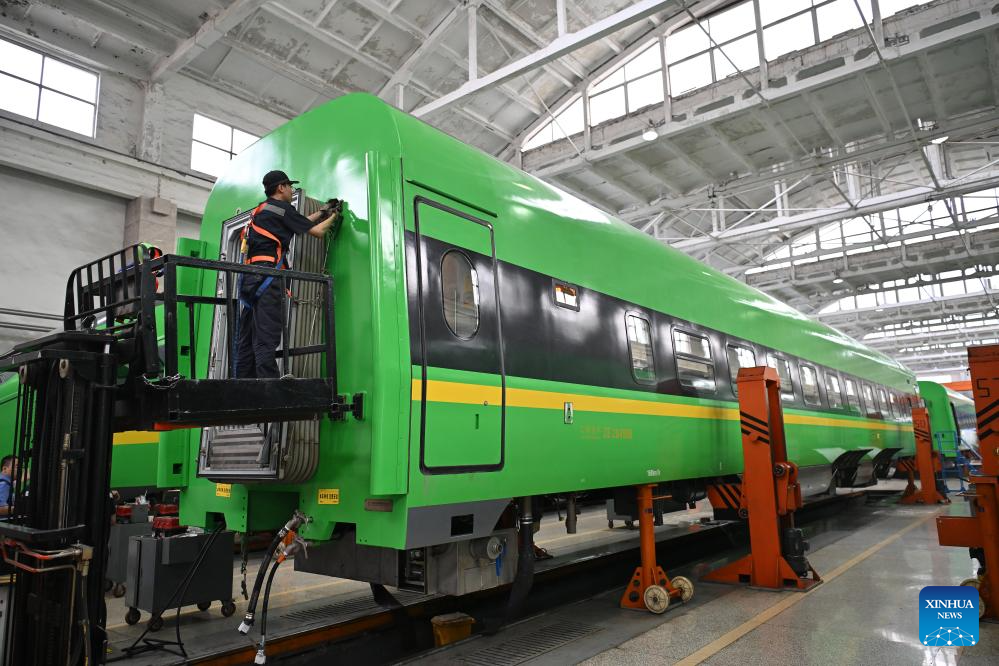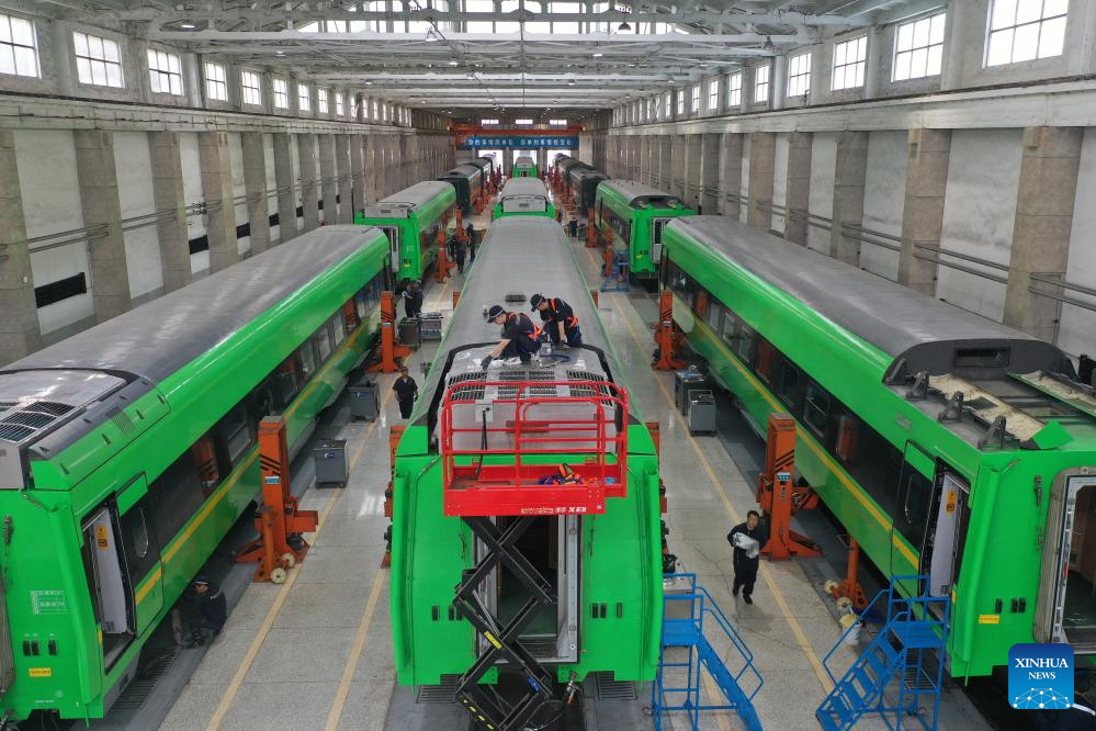 Staff members examine and maintain a train at a depot of China Railway Taiyuan Group Co., Ltd. in Taiyuan, north China's Shanxi Province, June 17, 2025. Staff memebers of China Railway Taiyuan Group Co., Ltd. has stepped up maintenance of trains to ensure safe travel for the upcoming summer travel rush. (Xinhua/Zhan Yan)