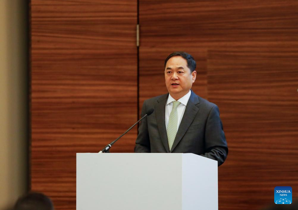 Yang Wanming, president of the Chinese People's Association for Friendship with Foreign Countries, addresses the first German-Chinese City Summit in Frankfurt, Germany, June 17, 2025. (Xinhua/Zhang Fan)