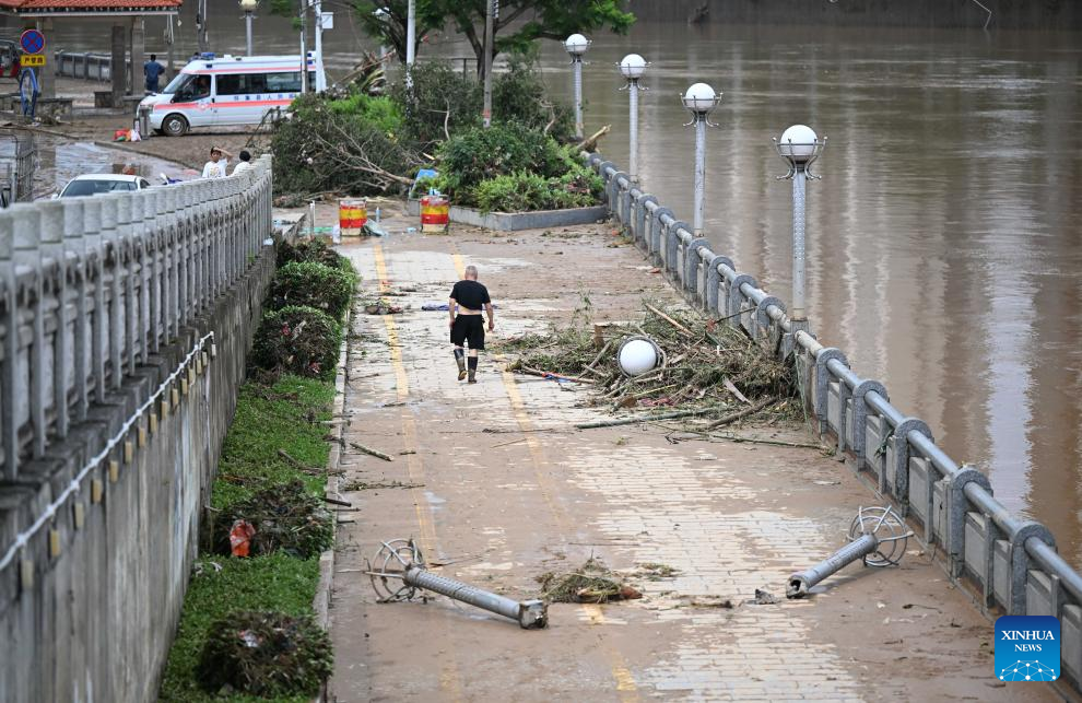 Facilities are damaged by floods on a riverbank in Huaiji County, south China's Guangdong Province, June 19, 2025. (Xinhua/Deng Hua)