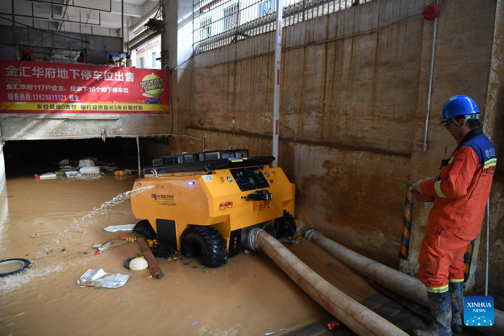 A staff member from China Southern Power Grid operates a machine to pump water at an underground parking place in Huaiji County, south China's Guangdong Province, June 19, 2025.(Xinhua/Deng Hua)