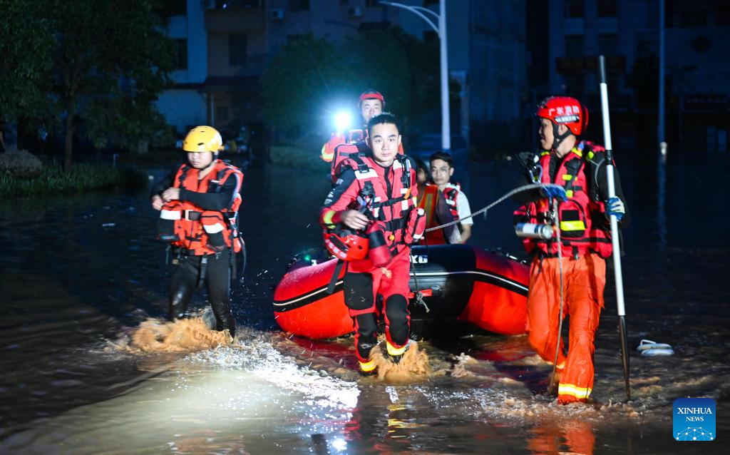 Firefighters transfer flood-hit residents in Huaiji County, south China's Guangdong Province, June 18, 2025. The National Development and Reform Commission on Wednesday said that it has allocated 60 million yuan (about 8.36 million U.S. dollars) from China's central budget to bolster flood relief efforts in Guangdong Province. The funds will be directed toward restoring infrastructure and public services in Guangdong's affected regions, according to the commission. Severe flooding has recently struck the province, with Zhaoqing City among the hardest-hit areas. As of noon on Wednesday, continuous heavy rainfall had affected approximately 300,000 residents of Huaiji County, which is administered by Zhaoqing City, and about 70,000 people had been relocated to safer areas, according to local authorities. (Xinhua/Deng Hua)