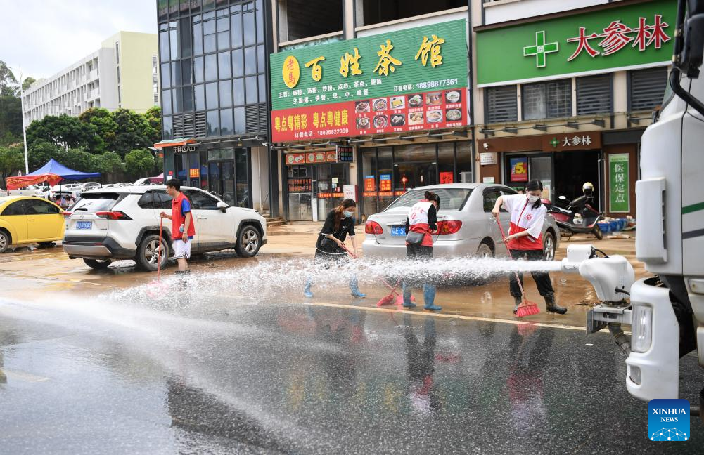 Volunteers clean up a flood-hit street in Huaiji County, south China's Guangdong Province, June 19, 2025. (Xinhua/Deng Hua)