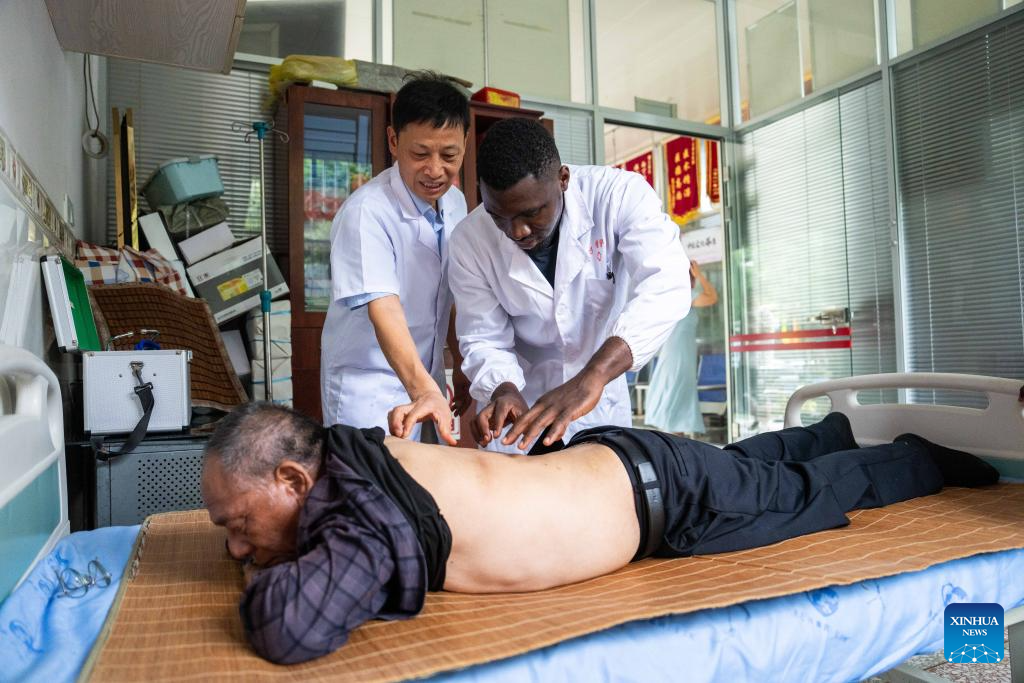 International student Ekpene Mabel Solomon (1st R) from Nigeria and Ng'onga Chiyumbe Kachinga (1st L) from Zambia learn about massage therapy at the first affiliated hospital of Changsha Medical University in Changsha, central China's Hunan Province, June 18, 2025.