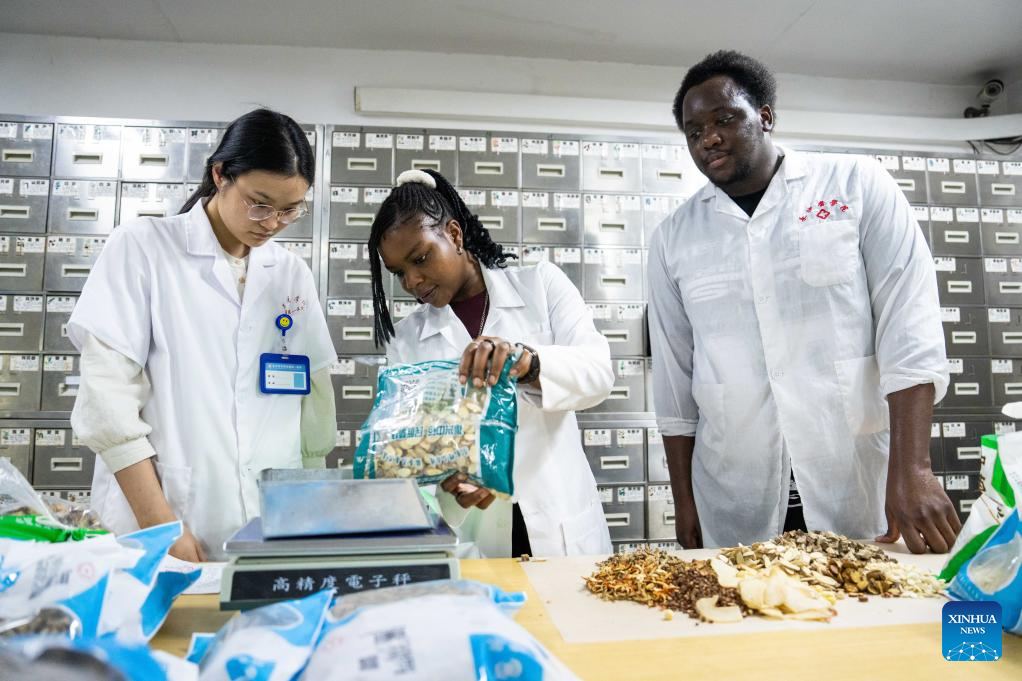 International student Ng'onga Chiyumbe Kachinga (1st L) from Zambia collects Chinese medicine at the first affiliated hospital of Changsha Medical University in Changsha, central China's Hunan Province, June 18, 2025.
