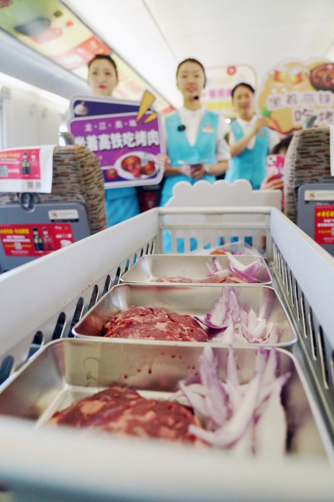 A passenger (L) tries to prepare Qiqihar barbecue on train D6993 in northeast China's Heilongjiang Province, June 18, 2025. (Xinhua/Wang Song)A steward shows heated Qiqihar barbecue on train D6993 in northeast China's Heilongjiang Province, June 18, 2025. (Xinhua/Wang Song)A steward and a stewardess invite passengers to taste Qiqihar barbecue on train D6993 in northeast China's Heilongjiang Province, June 18, 2025. (Xinhua/Wang Song)Stewardesses show prepared raw meat for making Qiqihar barbecue on train D6993 in northeast China's Heilongjiang Province, June 18, 2025. (Xinhua/Wang Song)