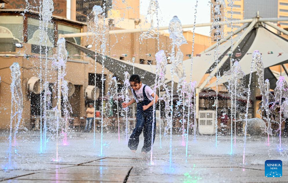 A girl plays at a fountain to cool herself off in Kuwait city, Kuwait on June 18, 2025. Kuwait experienced an intense heatwave in recent days. (Photo by Asad/Xinhua)
