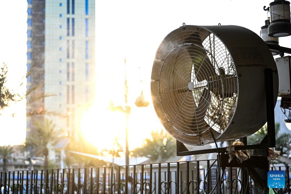 This photo taken on June 18, 2025 shows an electric fan installed with water sprays for cooling in Kuwait City, Kuwait. Kuwait experienced an intense heatwave in recent days. (Photo by Asad/Xinhua)