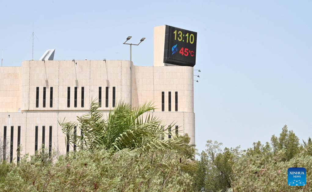 This photo taken on June 18, 2025 shows a screen displaying the temperature and time on top of a building in Kuwait City, Kuwait. Kuwait experienced an intense heatwave in recent days. (Photo by Asad/Xinhua)